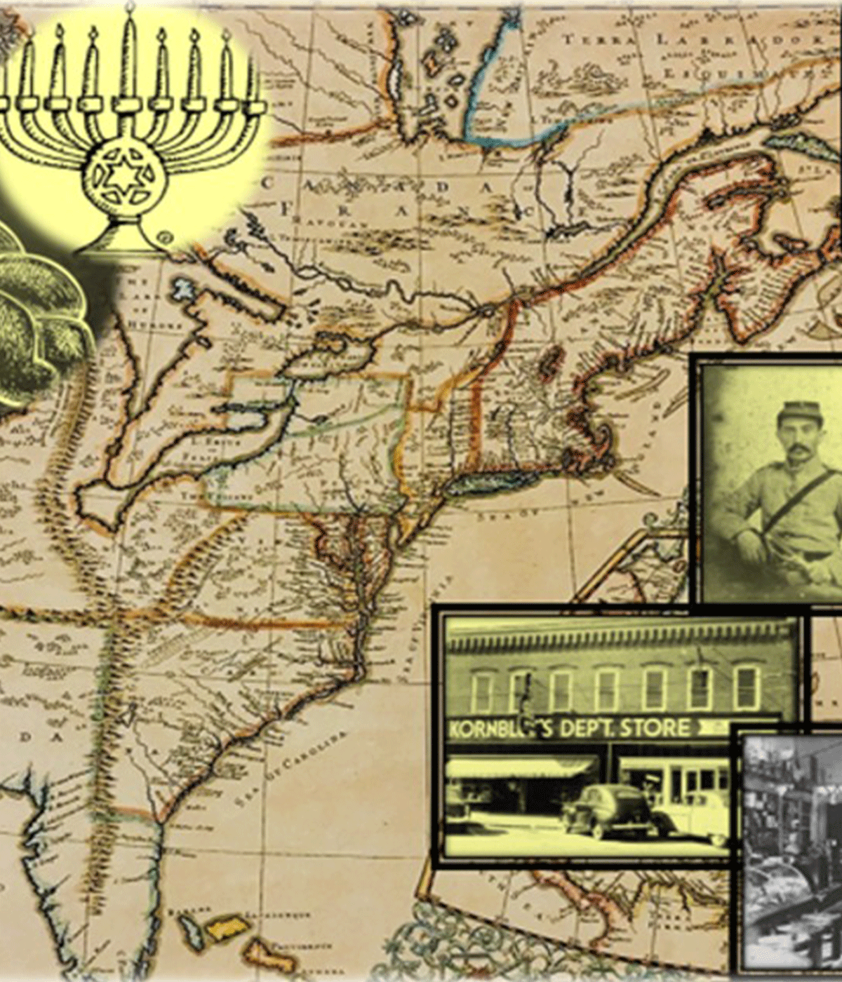 Collage with a vintage map of the eastern U.S., a menorah, and historic Jewish photos.